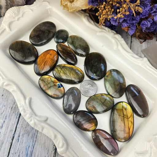 Our Labradorite Cabochons are hand cut and polished from all natural Multi Color Labradorite. These Labradorite Cabochons are sold as randomly sel...