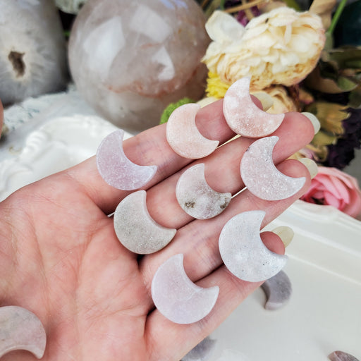 Like pastel sunsets decorated with puffs of colorful clouds, these Flower Agate Moons are soft and romantic. These moons have a more defined cresce...