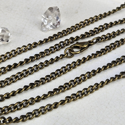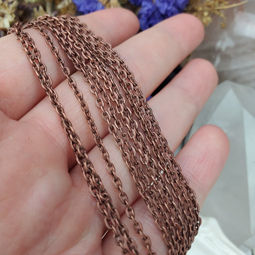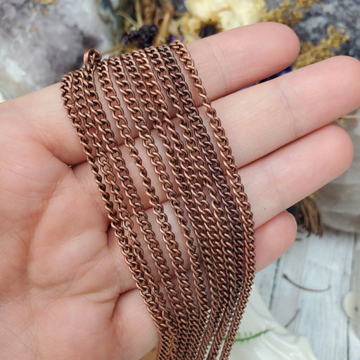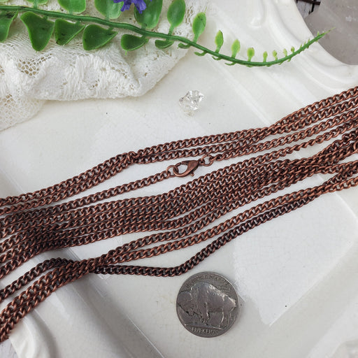 These Curb style Chains come in 18" and 24", the links are 3 mm. They are nickel free Copper plated Steel. Click here to see all Chain