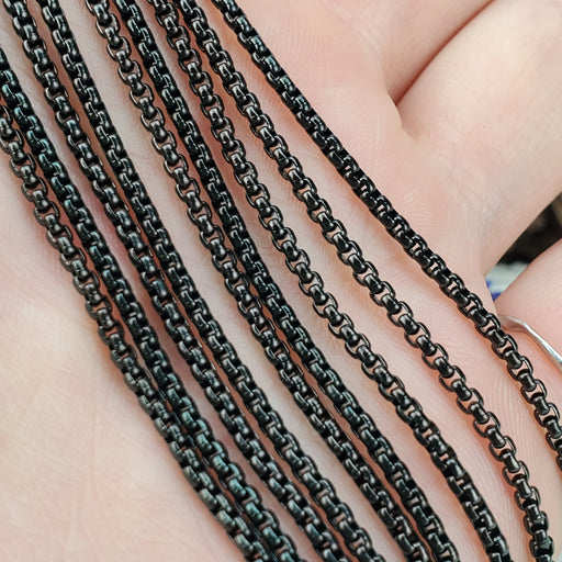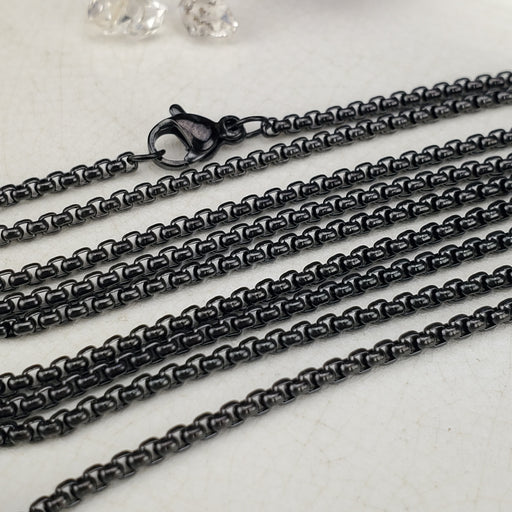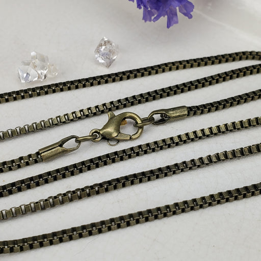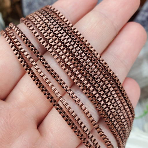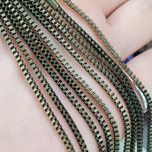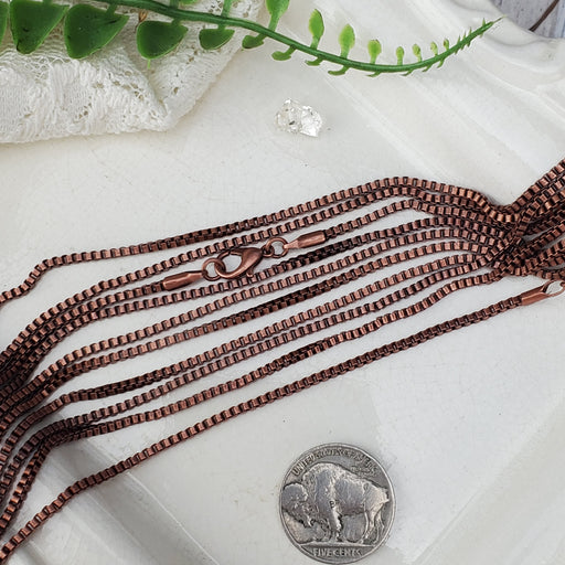 These Box style Chains come in 18" and 24", the links are 2mm. They are nickel free Copper plated Steel. Click here to see all Chain
