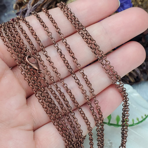 These Rolo style Chains come in 18" and 24", the links are 2.5mm. They are nickel free Copper plated Steel. Click here to see all Chain