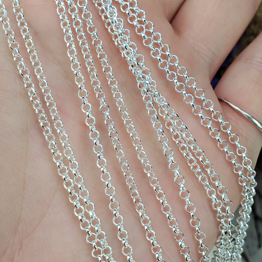 These Rollo Chains come in 18" and 24", the links are 2.5mm. They are nickel free Silver plated Steel. Click here to see all Chain