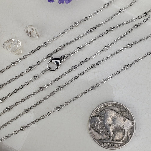These Beaded Curb Chains come in 18" and 24", the links are 2mm. They are nickel free Stainless Steel. Click here to see all Chain