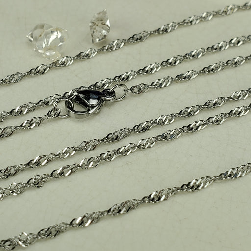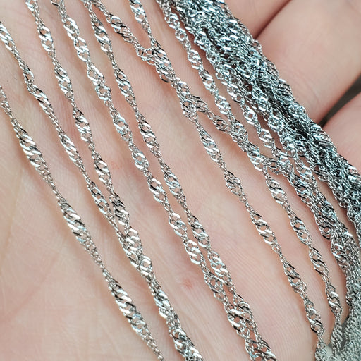 These dainty Twist style Chains come in 18". The links are 1.5mm. They are nickel free Stainless Steel. Click here to see all Chain