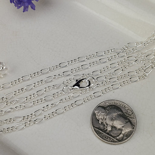 These dainty Figaro Chains come in 18" and 24", the links are 2.5mm. They are nickel free Silver plated Steel. Click here to see all Chain