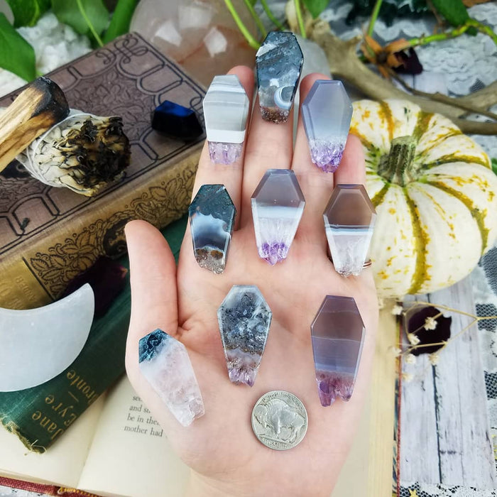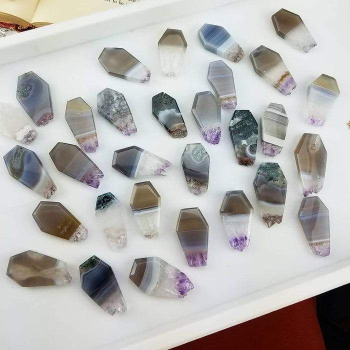 These Amethyst and Agate Coffins are sold as randomly selected single pieces. They are approximately 1 1/2'' long and 3/4'' at their widest.