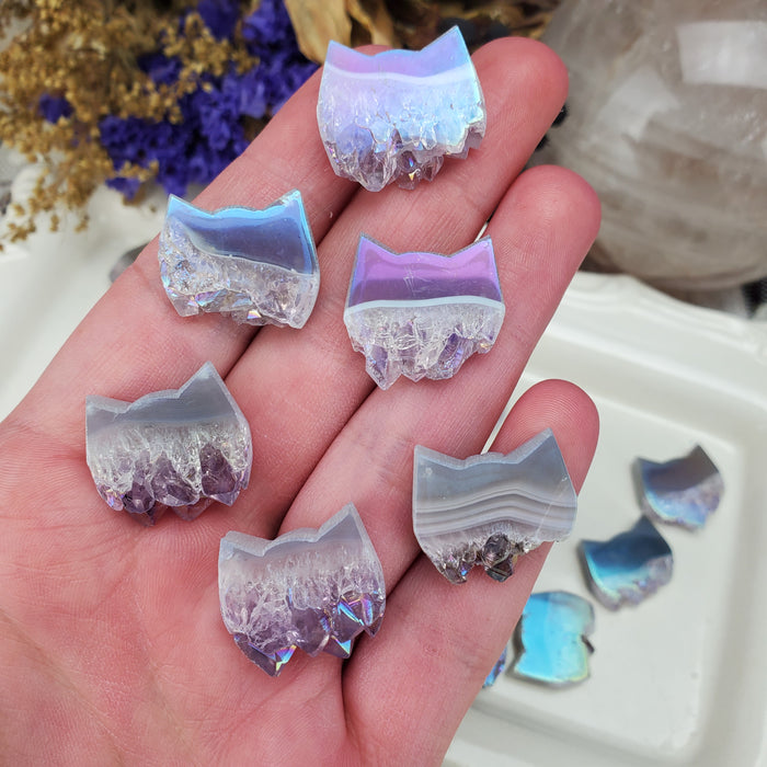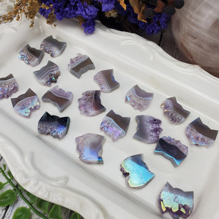 These Brazilian Amethyst, Quartz, and Agate Aura Cat Heads are sold as randomly selected single pieces. They are roughly 1x1", are roughly 1/4" thick and are polished flat on top and bottom with unpolished sides. They have aura on one side, with the other side left natural.
