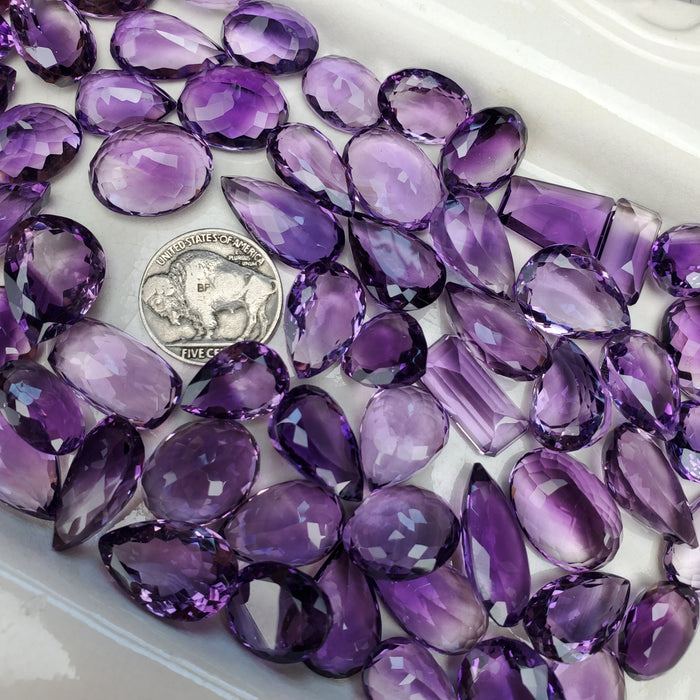 These gorgeous chunky Amethyst facets glitter and glint in the light. Their color a rich and deep purple.