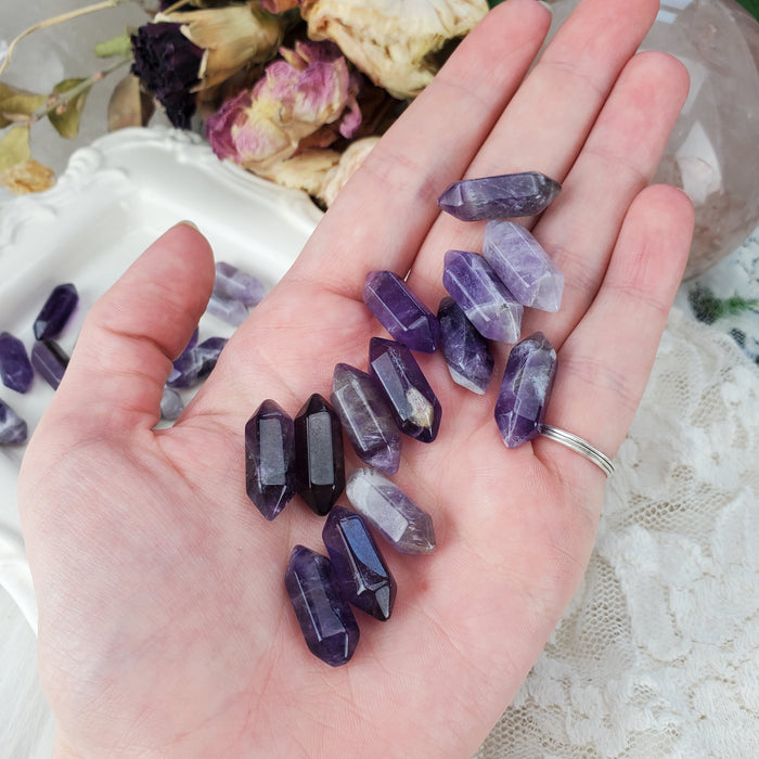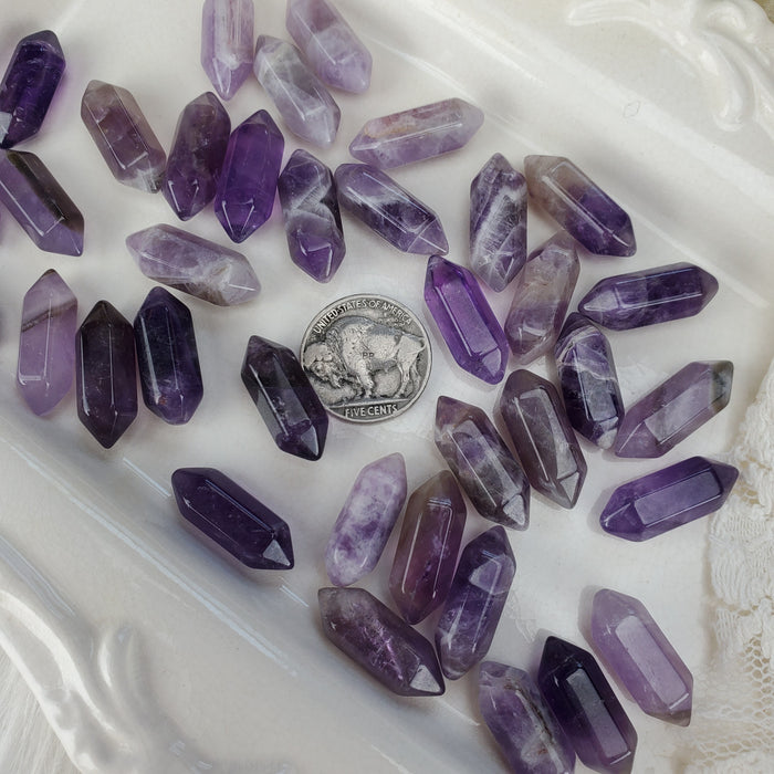 Our Amethyst Double Terminated Points are sold as randomly selected single pieces. They range from approximately 3/4''- 7/8'' long and 3/8'' wide. They are slightly tumbled.