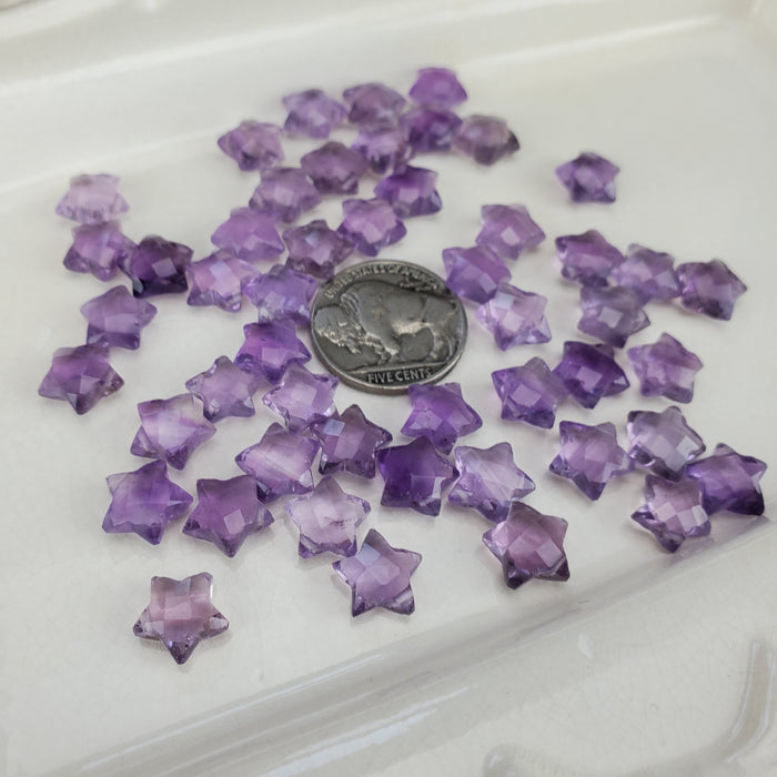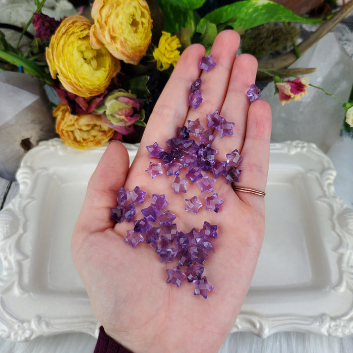 Our Amethyst Faceted Stars are sold as randomly selected single pieces. They are approximately 10mm and faceted on both sides. They are drilled, the hole is roughly .3mm wide.