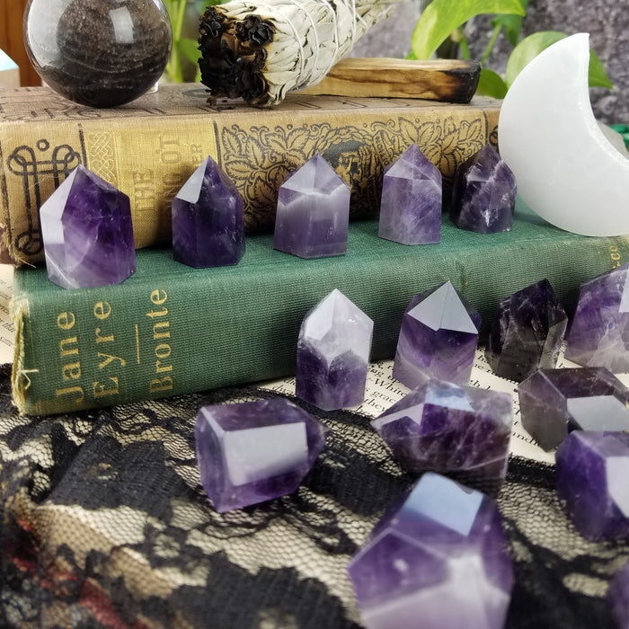 These Small Amethyst Points are sold as randomly selected single pieces. They are approximately 1 1/4'' tall and 3/4'' wide. They have flat bottoms, polished sides and tapered tips.