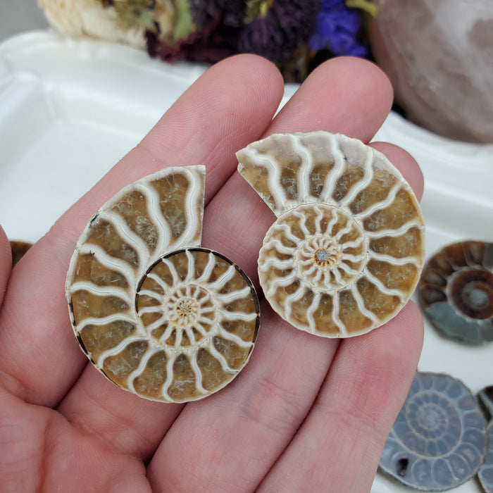 Our Ammonite Splits are sold as randomly selected Pairs. They are approximately 1" - 1 1/2" long. These have fully polished faces with raw, pearlized, backs.