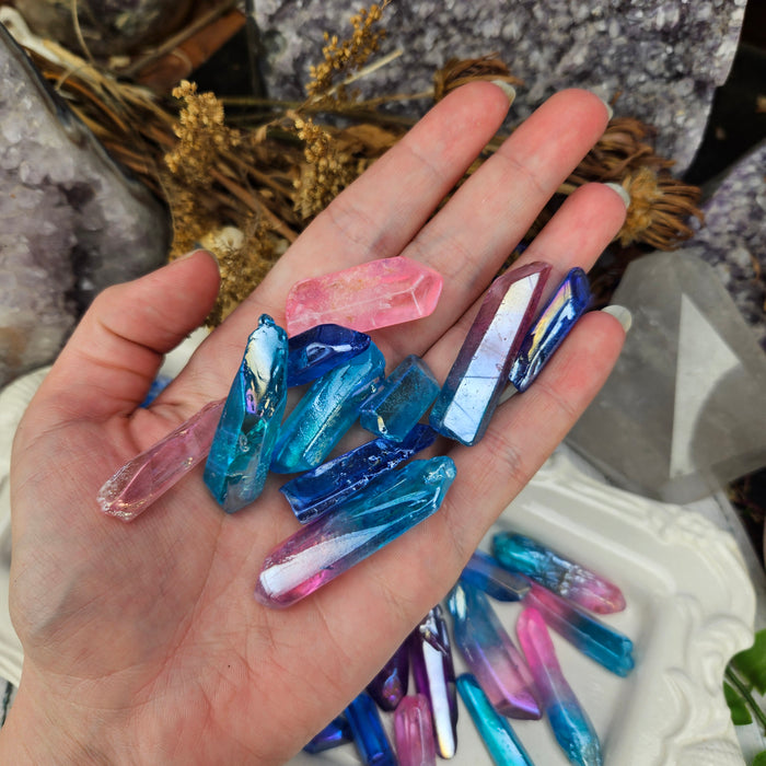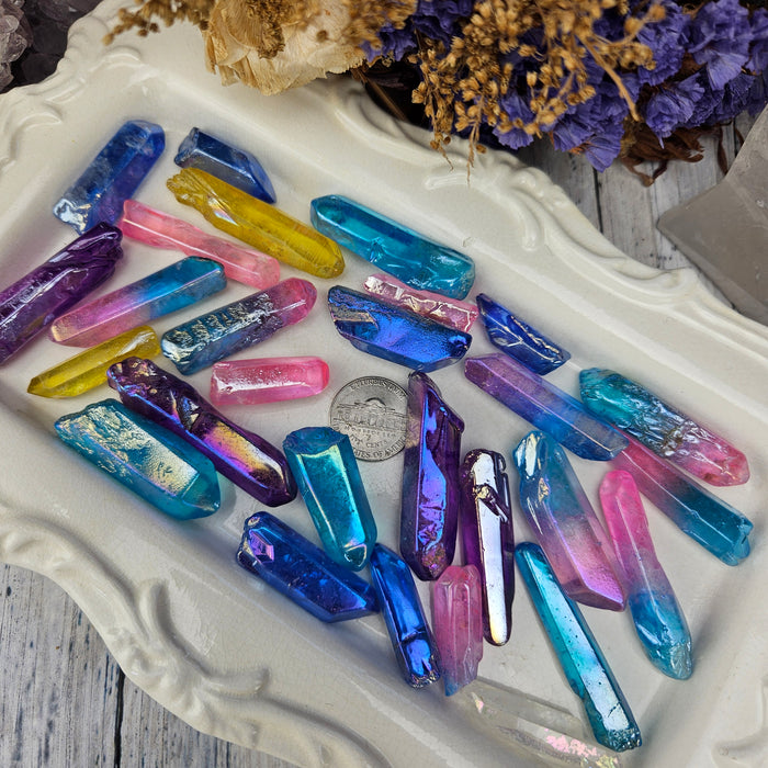 Our Aura Quartz Points are sold as randomly selected single pieces. They range from approximately 1''- 2 1/2'' long and 1/2''- 1'' wide. They are a variety of color, shape, and quality.