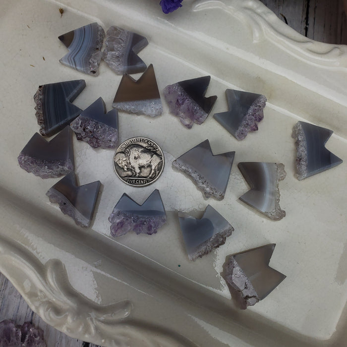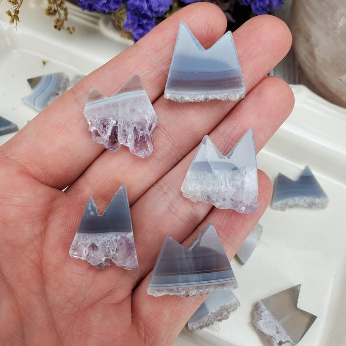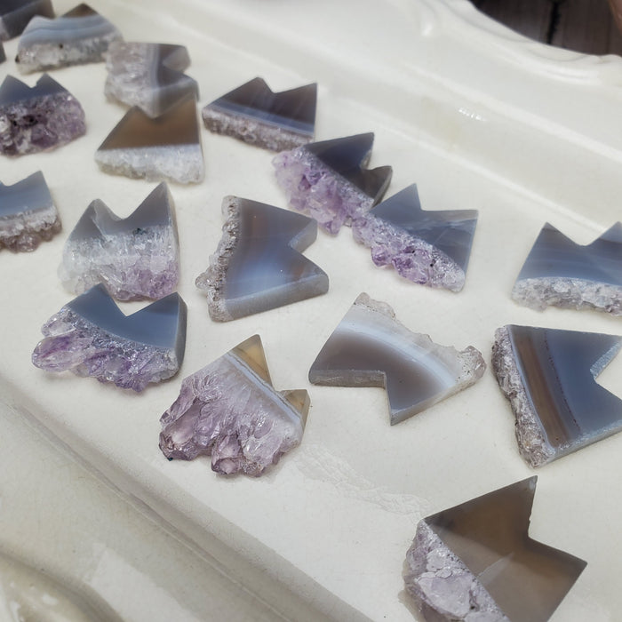 These Brazilian Amethyst and Agate Mountains are sold as randomly selected single pieces. They are approximately 1x1" and ¼" thick and are polished flat on top and bottom.