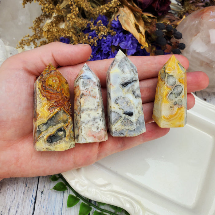 Our Crazy Lace Agate are sold as randomly selected single pieces. They are approximately 2" - 3" long. They are fully polished with wide, flat, bottoms.