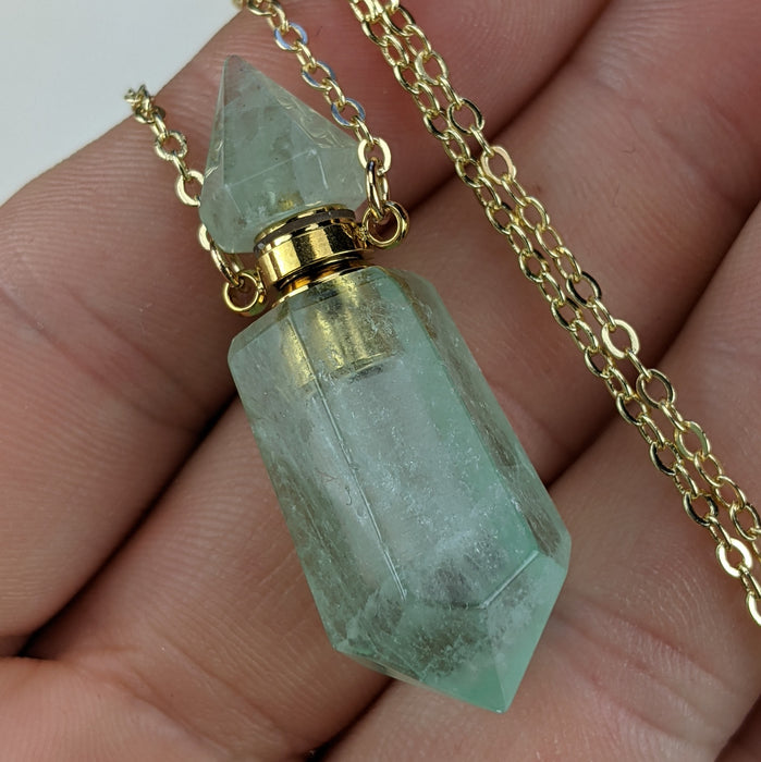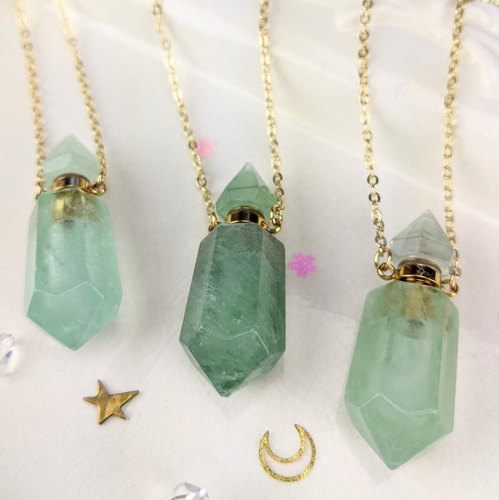 Our Fluorite Perfume Bottles are sold as randomly selected single pieces. They are approximately 1 1/2'' long and 1/2'' at the widest. They are fully polished, deeply drilled, and comes on a 24'' plated chain.