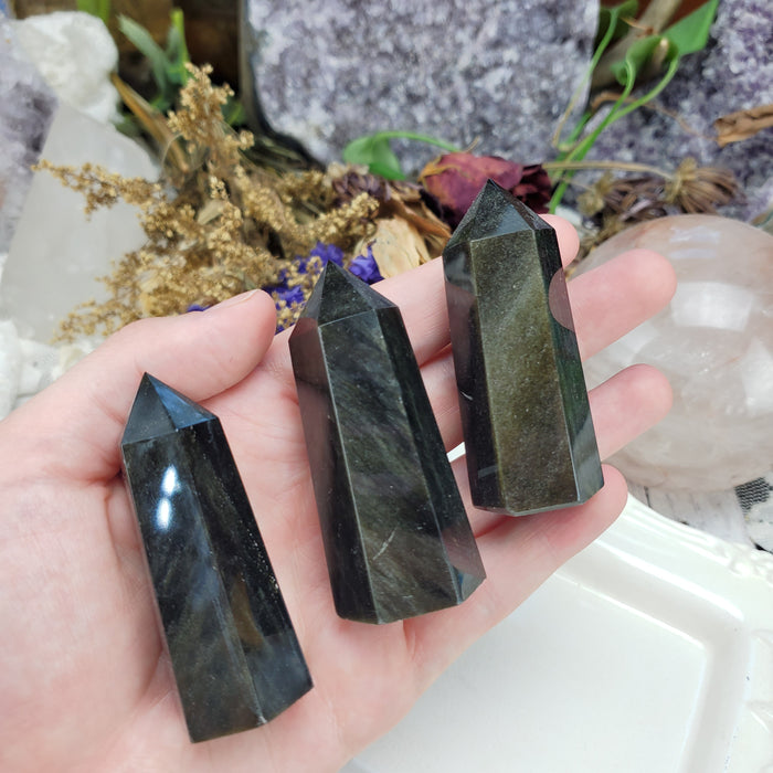 Our Gold Sheen Obsidian are sold as randomly selected single pieces. They are approximately 2 1/2" long. They are fully polished with wide, flat, bottoms.