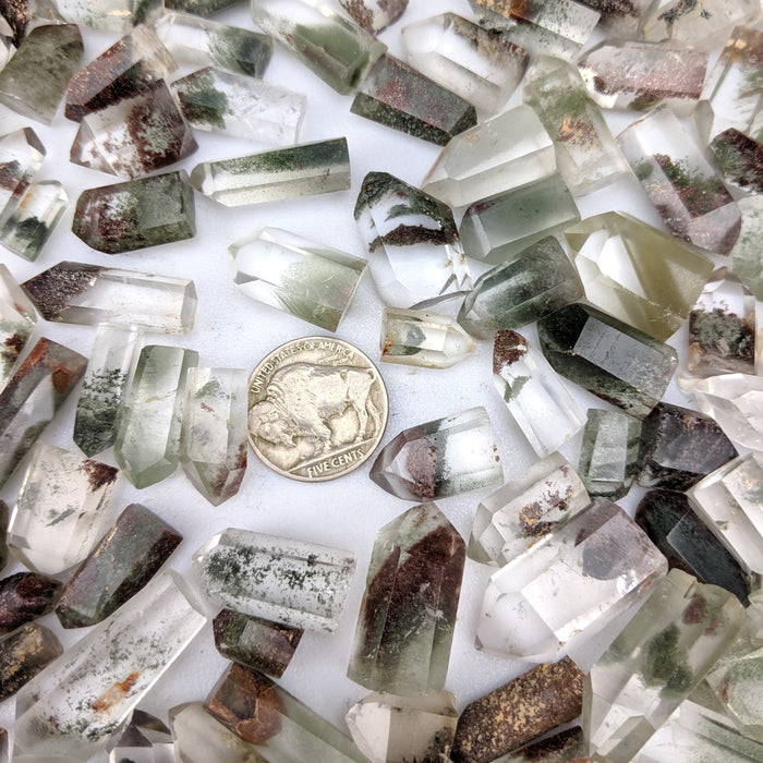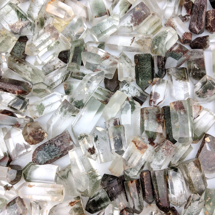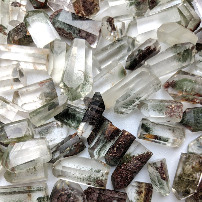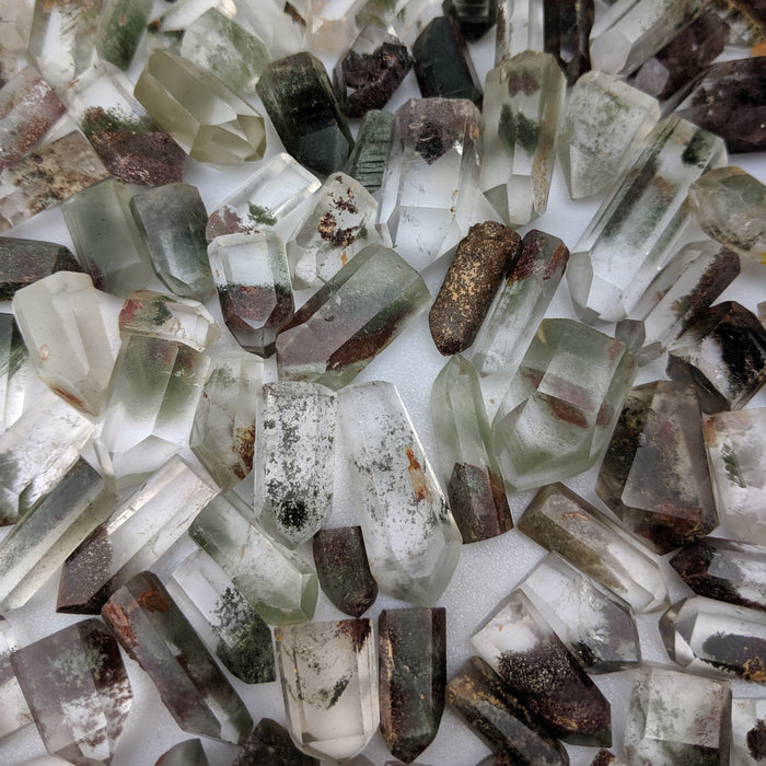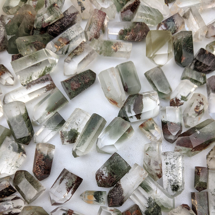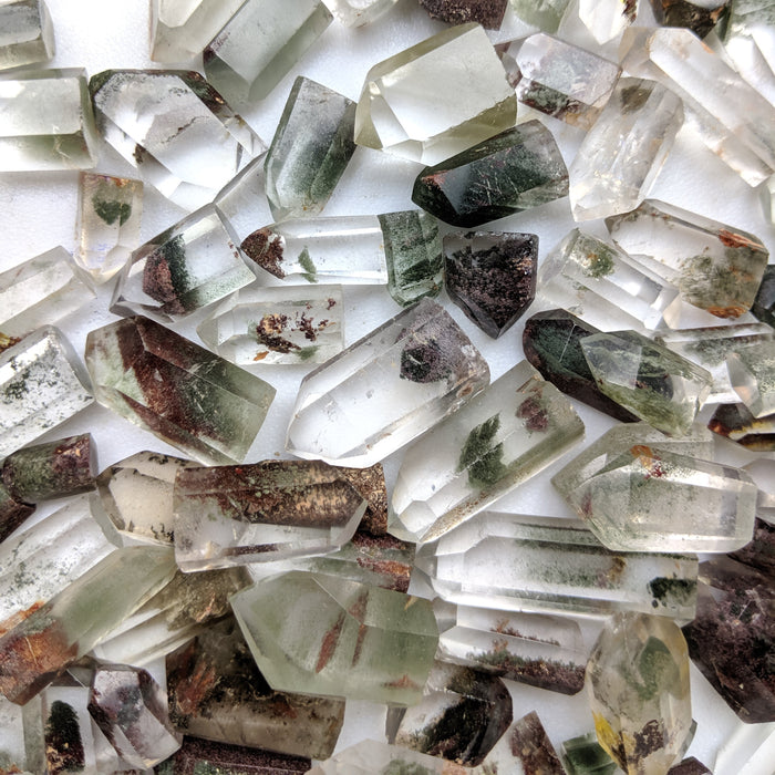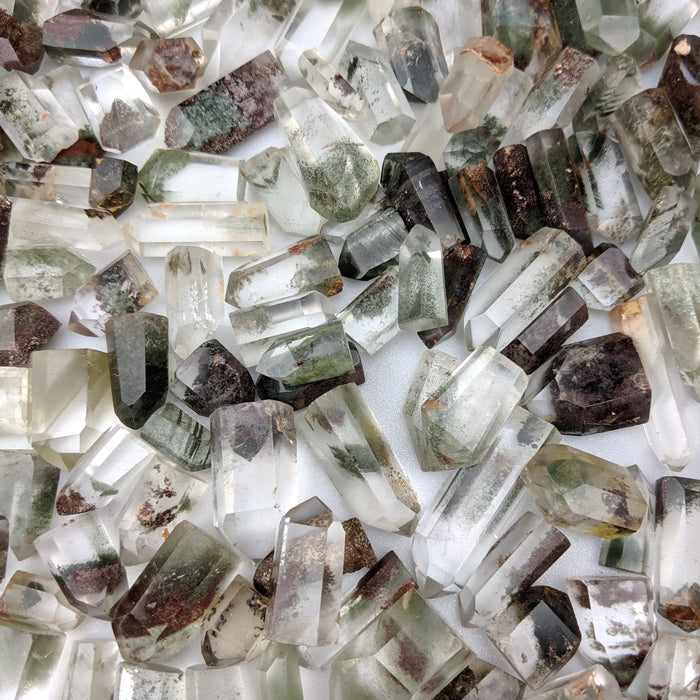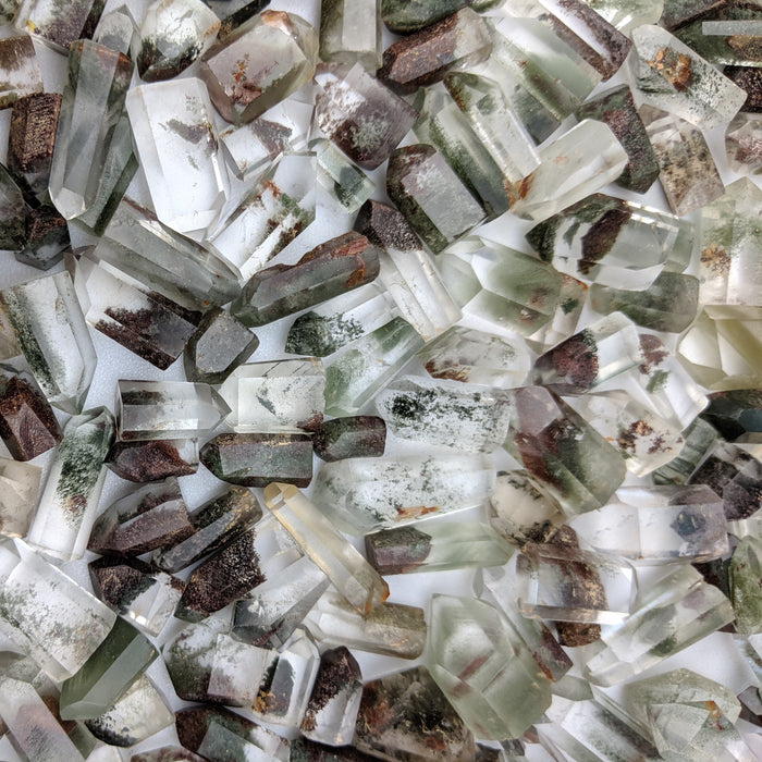 Our Green Quartz Points are hand cut and polished from all natural Brazilian Quartz Crystals with a variety of inclusions that give them their green color. Pieces have a variety of Chlorite, Lodolite (sand), rutile, and possible other inclusions. You will find many phantoms in this mix. While all pieces have some green in them, there may be other colors as well including red, gold, etc.