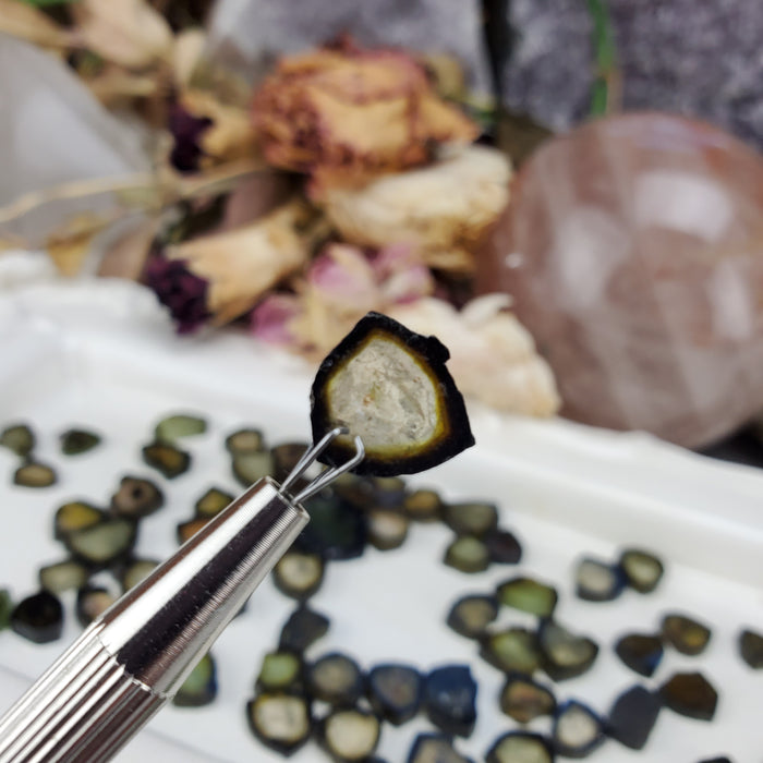 Our Green Tourmaline Slices are sold as randomly selected single pieces. They range from approximately 5mm-10mm. They are raw, unpolished slices.