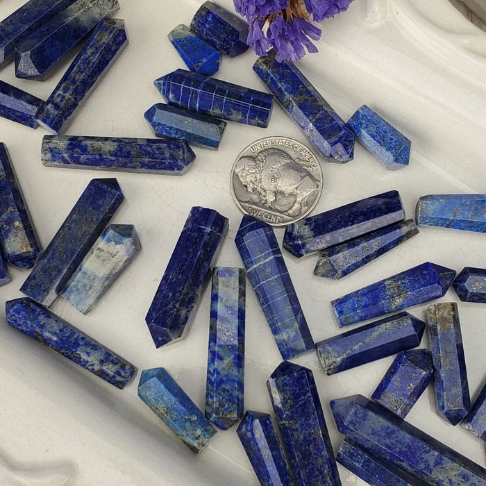 Our Lapis Lazuli Points are sold as randomly selected single pieces. They range from approximately 1/2"- 2" long and approximately 3/8" - 1/2" wide at the base.
