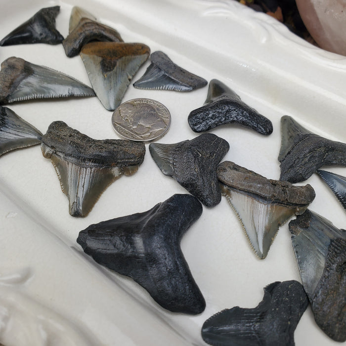 Our Megalodon Teeth are sold as randomly selected single pieces They range from approximately 1"- 1 1/2" at the widest and 1" - 1 3/4" long. These are polished fossilized teeth, some have missing tips, or others natural chips.