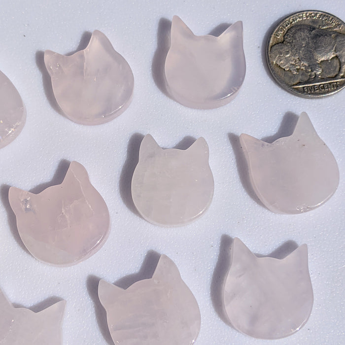 These Mini Brazilian Rose Quartz Cat Heads are sold as randomly selected single pieces. They are approximately ¾x¾" and ¼" thick and are flat on top and bottom.