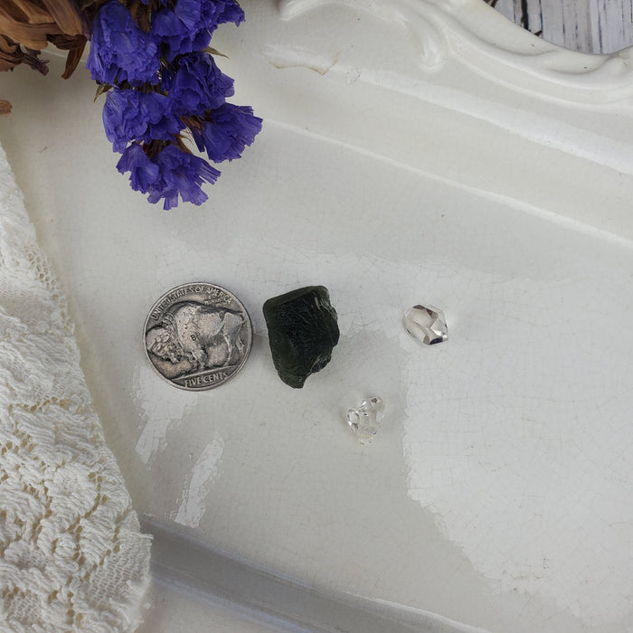 Photos are of 1 single piece shown from different angles and under different light. You will receive the exact piece of Moldavite shown. Measurements and weight ~ 14x19mm, 2.87 grams. Minor chips may be present.