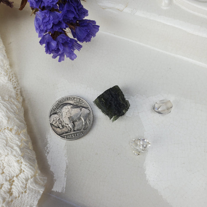 Photos are of 1 single piece shown from different angles and under different light. You will receive the exact piece of Moldavite shown. Measurements and weight ~ 14x14mm, 2.12 grams. Minor chips may be present.