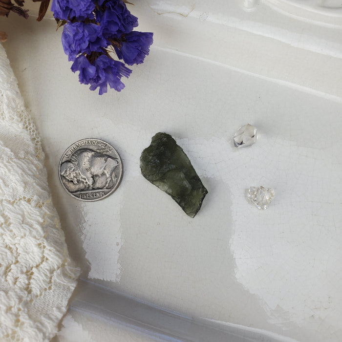 Photos are of 1 single piece shown from different angles and under different light. You will receive the exact piece of Moldavite shown. Measurements and weight ~ 15x30mm, 2.14 grams. Minor chips may be present.