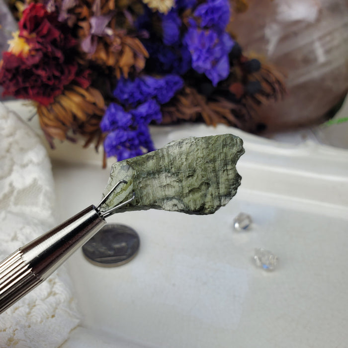 Moldavite, a gorgeous forest-green Tektite, was formed millions of years ago when Earth was impacted by a large meteorite! The collision so hot, so intense, it fused terrestrial silicas to create this unique gemstone. This is Moldavite Piece is unique and beautiful, with lovely elongated internal bubbles and wispy lechatelierite.