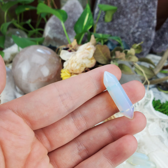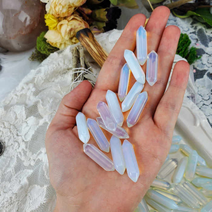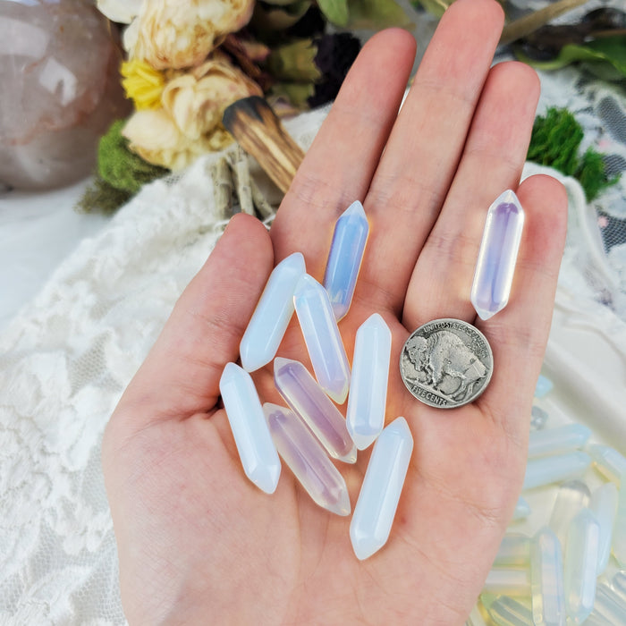 Our Opalite Double Terminated points are approximately 1 1/4'' long and 1/4'' wide. They are tumble polished.