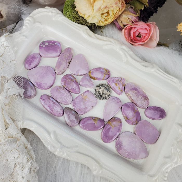 Soft florals, orchids, and mauve- these Phosphosiderite Cabochons are divinely feminine. Their gentle purple hues are pleasant with eye catching veins of golden-brown running through.