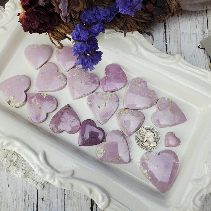 Our Phosphosiderite Heart Cabochons are sold as randomly selected single pieces. They range from approximately 1/2" - 1 1/4" tall. They are flat backed with convex tops.