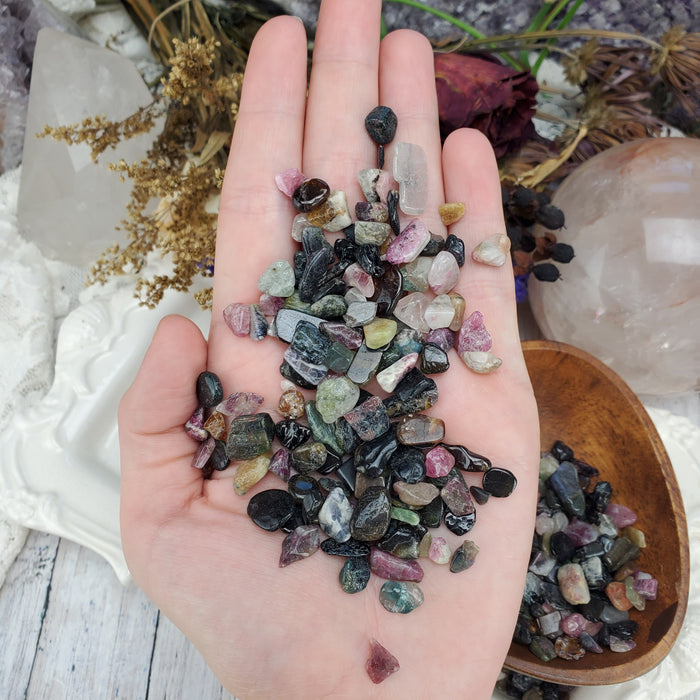 Our Rainbow Tourmaline Crystal Chips are sold in approximately 50 gram bags. They range from approximately 1/4''-3/8''. These pieces are mostly round, uneven, natural chips.