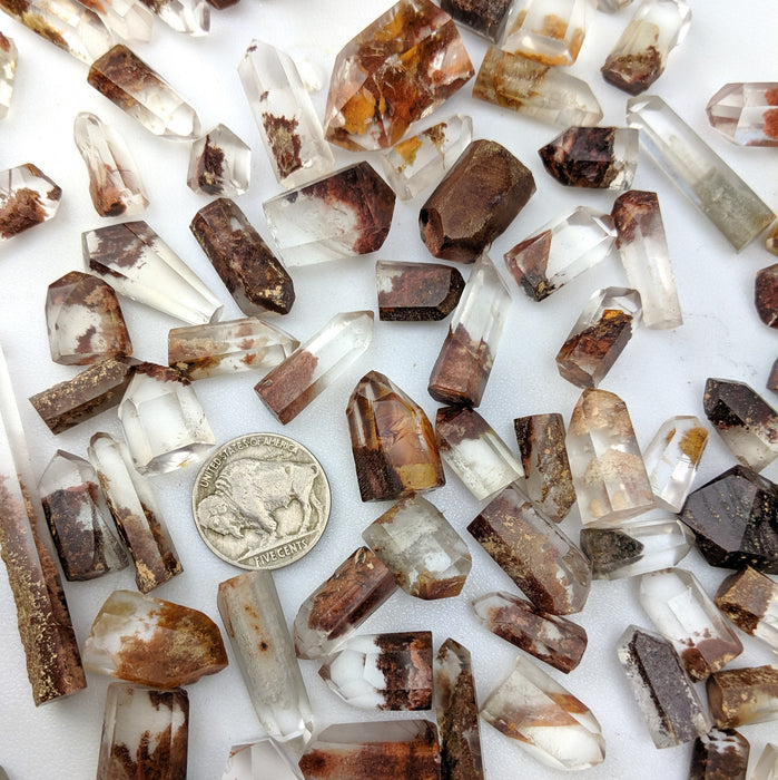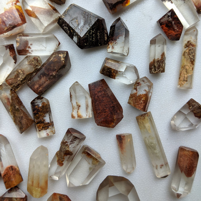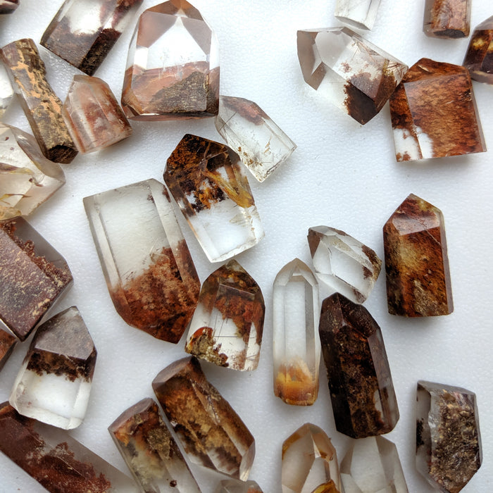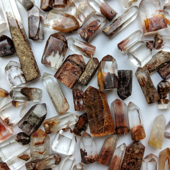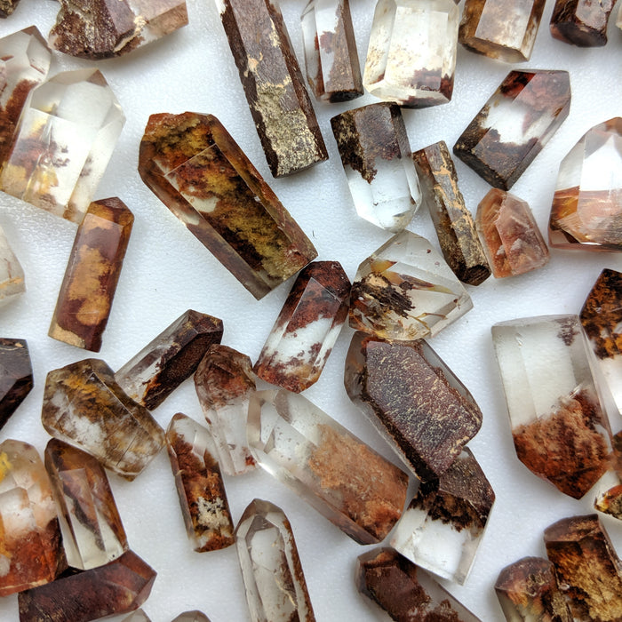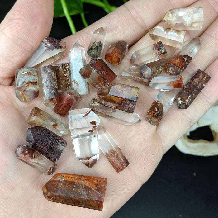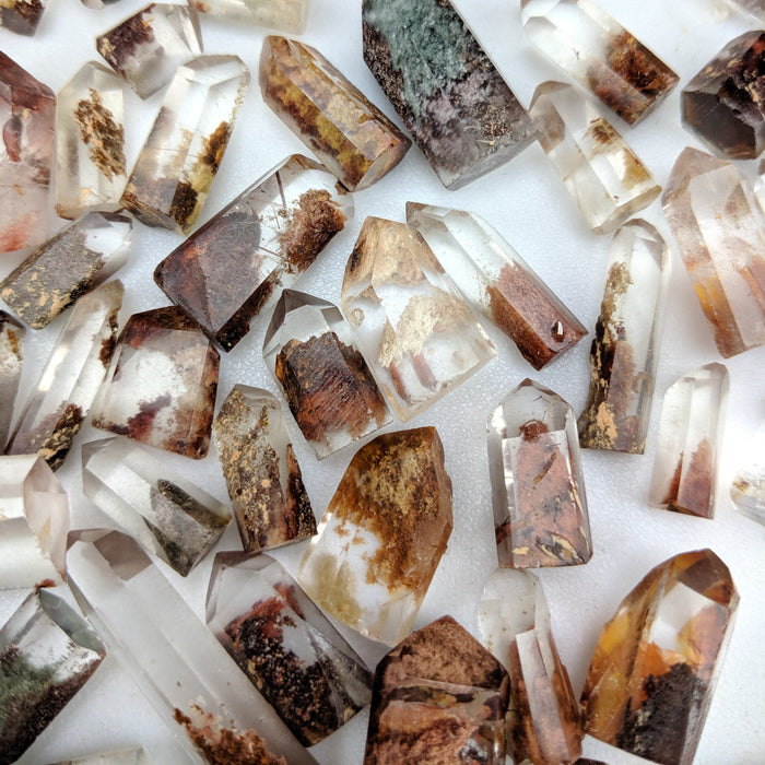 Our Red Quartz Points are hand cut and polished from all natural Brazilian Quartz Crystals with a variety of inclusions that give them their red color. They have a variety of Lodolite (sand), rutile, Iron, and possible other inclusions. You will find many phantoms in this mix. Many also include golden rutile! While all pieces have some red in them, there may be other colors as well including tan, gold, etc.