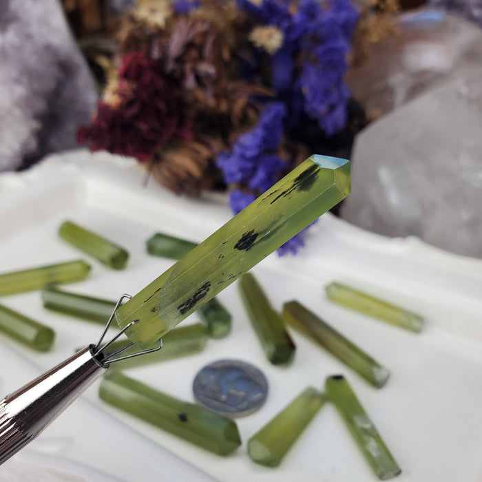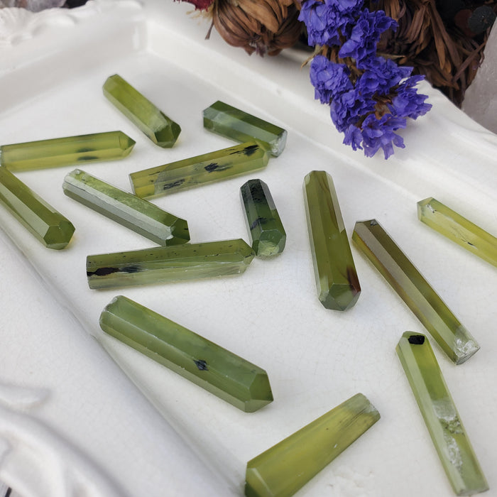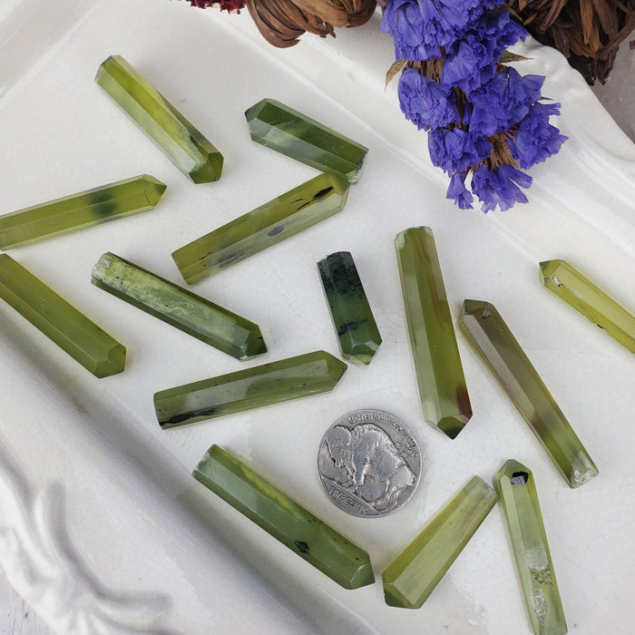 Our Serpentine Points are sold as randomly selected single pieces. They range from approximately 1"- 1 1/2" long and approximately 3/8" wide at the base. Most have Magnetite dots!