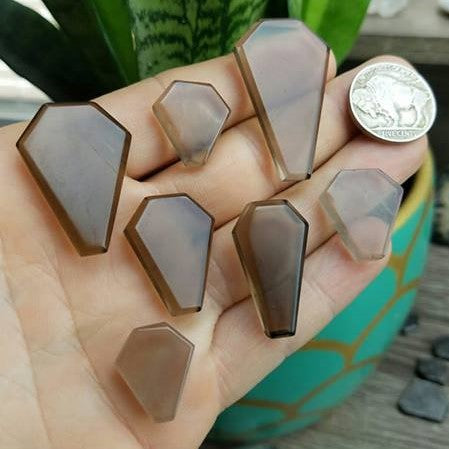 These Brazilian Smoky Quartz Coffins are sold as randomly selected single pieces. They are approximately 3/4-1 1/2", approximately 1/4" thick and are flat on top and bottom with faceted edges.