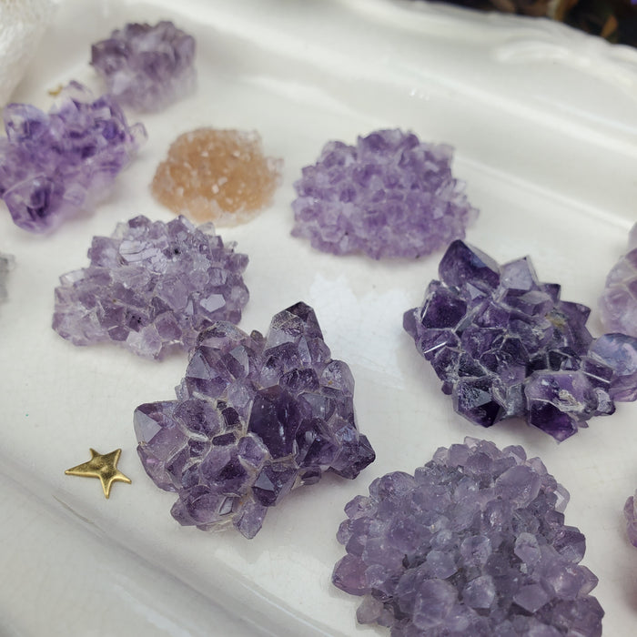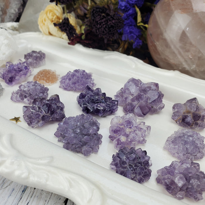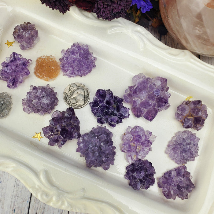 These gorgeous and gemmy Uruguay Amethyst Stalactite Roses are the perfect size for jewelry! These come in a range of shimmery and shiny color, from deep purple, dusky black, and crystalline white.