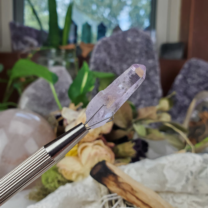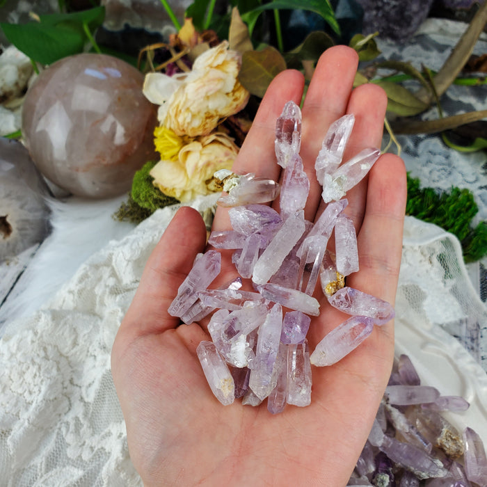These Vera Cruz Amethyst Crystals are sold as randomly selected singles. They range from roughly 1/2-1 1/2" measured from top to bottom, are roughly 3/16-3/8" wide.