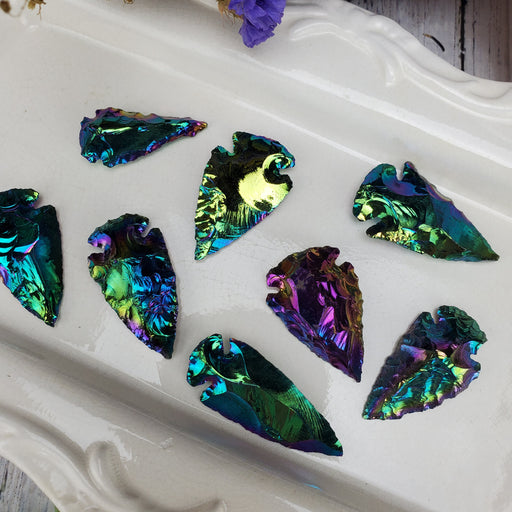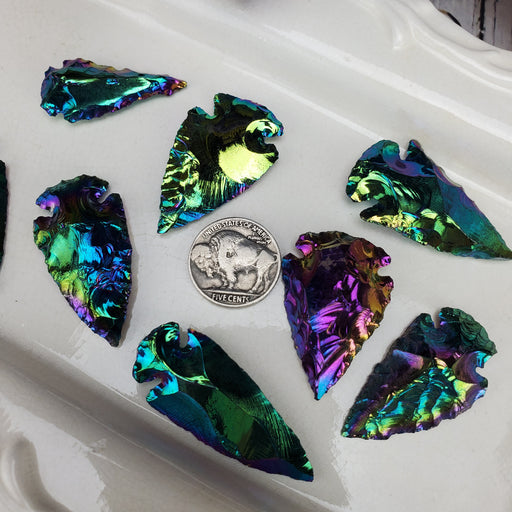 Our Obsidian Knapped Arrowheads are knapped from all natural Black Obsidian. These have been given a manmade titanium aura. Our Obsidian Knapped A...
