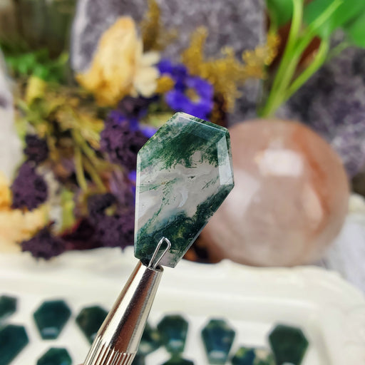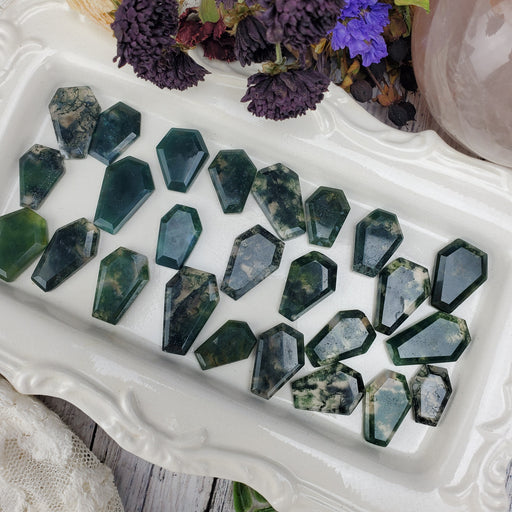 These Moss Agate Coffins are ethereal and other worldly. Their secret gardens locked, frozen, in time matched perfectly with this cut. Our Moss Ag...
