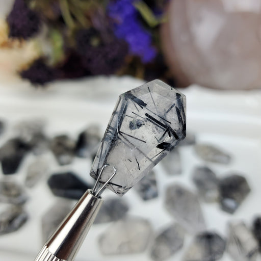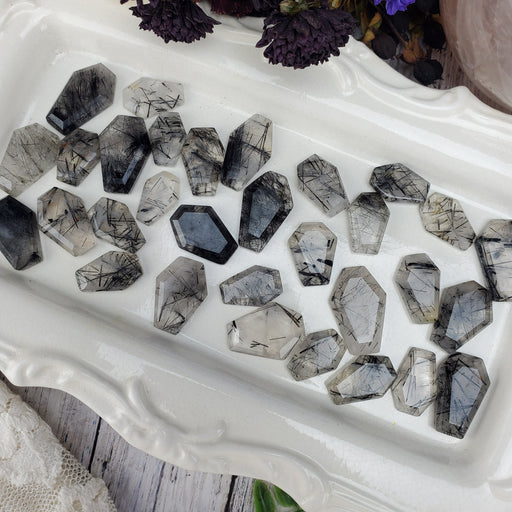 Our Black Black in Quartz Coffins are hand cut and polished from all natural Black Rutile included Quartz. Their black rods of Rutile jut wildly th...