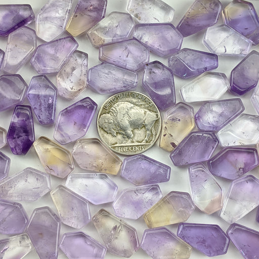 Our Amethyst Coffins are hand cut and polished from all natural Brazilian Amethyst, some pieces even have Ametrine (Ametrine occurs when Amethyst a...