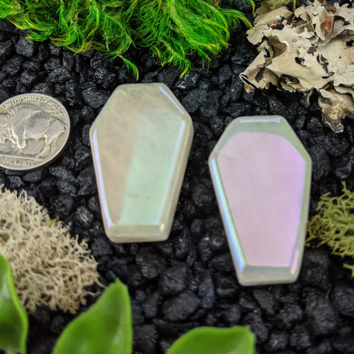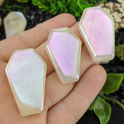 Our Aura Rose Quartz Coffins are hand cut and polished from all natural Brazilian Rose Quartz then bonded with Titanium to give them their iridesce...