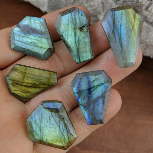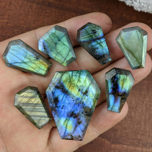 These Labradorite Coffin Cabochons are excellent quality, full of fire and flash! Our Labradorite Coffins are sold as randomly selected single pie...