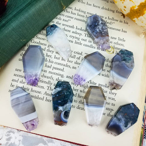 Our Amethyst and Agate Slice Coffins are incredibly dreamy. Long and lazy bands slowly give way to gorgeous Amethyst druzy. They are hand cut and p...