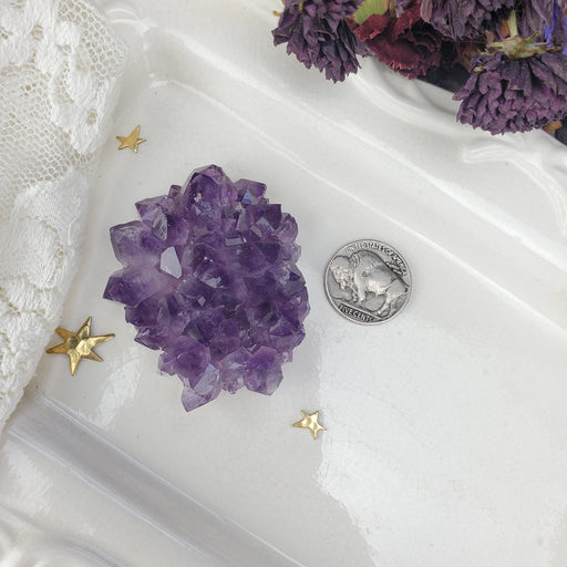 This Uruguay Amethyst Stalactite Rose is approximately 2 1/4" wide 3/4" thick. It has a flat polished bottom. Click here to see all Amethyst Roses