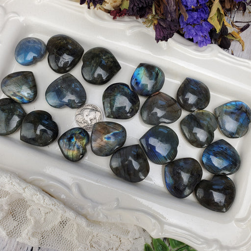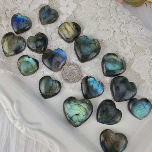 Our Labradorite Hearts are hand cut and polished in Madagascar from 100% natural Labradorite. These Madagascar Labradorite Hearts are sold as singl...