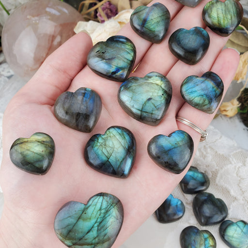 These handcut and polished Labradorite Hearts are full of light and color. Their mysterious color shine brightly, releasing the magic of the Aurora...