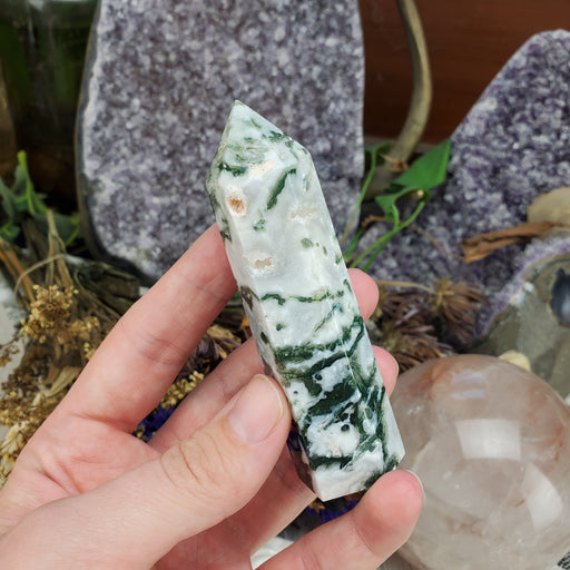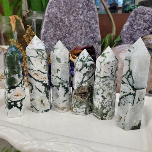 Our Tree Agate Towers are sold as randomly selected single pieces. They are approximately 3 1/4" - 4" long. They are fully polished with wide, flat...